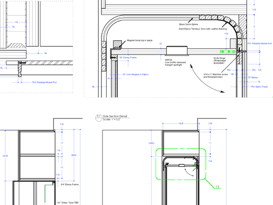 All drawings are prepared with manufacturing in mind. Materials and finishes are considered as well as hardware, custom or off the shelf. All details and options are closely examined so the right look and feel may be achieved.